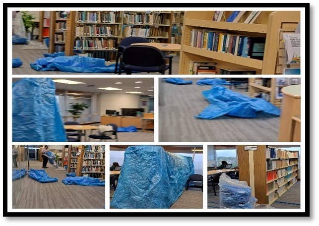 There was an interconnection between the theories, as taught in the study of archives and records management and its actual application. On this account, I felt that one of my lecturers conspired with the universe to assess my comprehension of ARCM 6003, Disaster Planning, Response and Recovery in Tropical Environments, when Tropical Storm Bret hit Barbados on June 20th – 21st, 2023. As the LISU intern, I was positioned to observe, participate, and experience the activation and implementation of the Banks Emergency Disaster Plan. Some aspects of the Banks disaster planning programme involved a responsive Emergency Team, Security personnel, and the Communication Unit. Another component of the Banks disaster plan for LISU, in which I participated, involved the removal and relocation of the library furniture from the windows; encasing all the library stacks to prevent initial water damage to the library collection, furniture and other assets. See the photograph below.