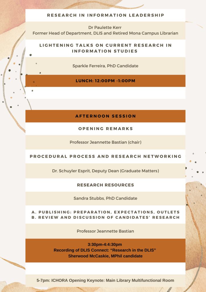 The afternoon session focused on the current MPhil/PhD candidates. The candidates as well as their supervisors, Dr. Stanley Griffin and Professor Jeannette Bastian returned for another round of presentations which included Deputy Dean, Graduate Studies and Research, Dr. Schuyler Esprit’s presentation on “Procedural Process and Research Networking.” Ms. Sandra Stubbs (DLIS PhD candidate) presented on “Research Resources” and Professor Bastian presented on “Publishing: Preparation, Expectations, and Outlets”.