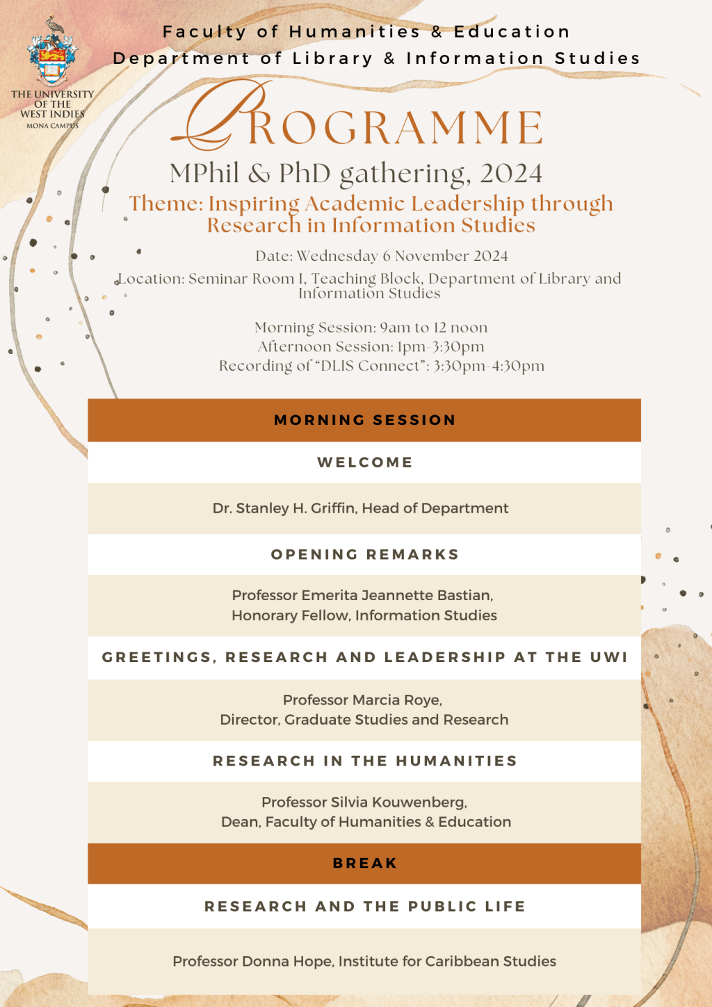 The Department was thrilled to host our very first MPhil/PhD gathering on Wednesday, November 6, 2024. The theme was “Inspiring Academic Leadership through Research in Information Studies”. The aim was to encourage both current and potential research students in presentations and conversation that will foster interest in graduate research in Information Studies, as well as build a new cadre of researchers in the Department.