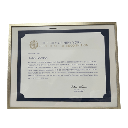 This honor celebrates John’s significant contributions to the Neighborhood Stories Project, an initiative supported by the New York City Department of Records and Information Services aimed at preserving and sharing the rich tapestry of stories from local communities.